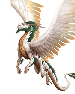 Self-appointed guardians of the Twin Paradises, these great creatures are extremely powerful and will come to the aid of any intelligent creature. It should be noted, however, that they are unconcerned with law or chaos, but only the protection of sentient lifeforms. Ironically, they have little place in the ecosystem of the Twin Paradises. They can, however, be avaricious hunters with huge appetites, especially as they have no moral objection to hunting unintelligent lifeforms for food.